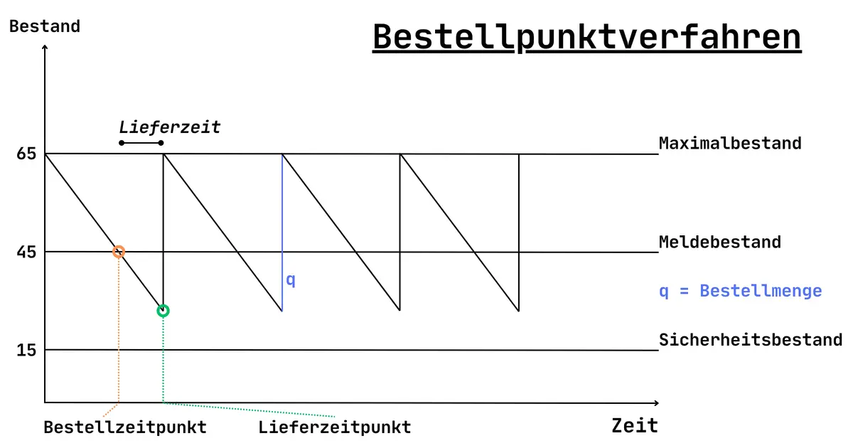 Beim Bestellpunkt-Verfahren wird eine Bestellung immer dann ausgelöst, wenn der Lagerbestand einen festgelegten Bestellpunkt erreicht oder unterschreitet. Dieser Bestellpunkt berücksichtigt:
