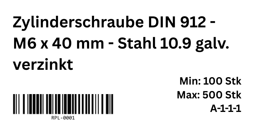 - Richtig: Code "RPL-0001" nur 1x, verlinkt auf Zylinderschraube DIN 912 - M6 x 40 mm - Stahl 10.9 galv. verzinkt