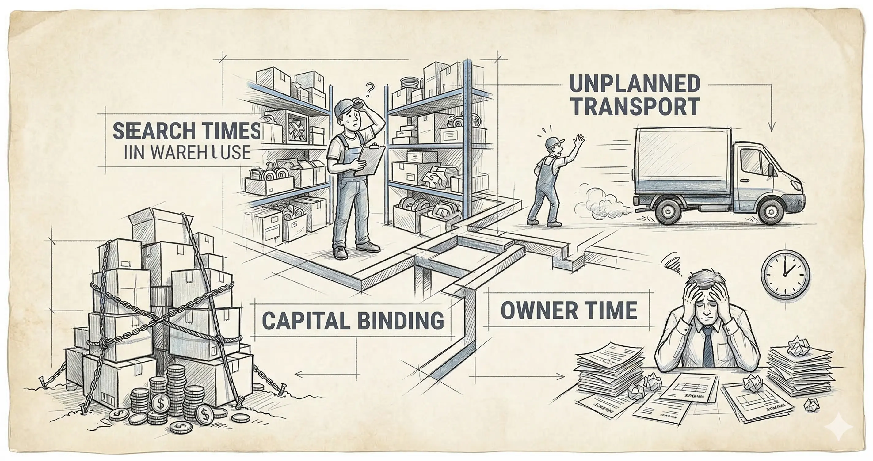 Stefan is not an exception. Most small trades businesses don't have a warehouse cost problem on paper — they have a transparency problem in day-to-day operations. Rent and materials show up in the books. The hidden costs don't. That's exactly what creates search time, emergency runs, overstock, and an owner who becomes the bottleneck.