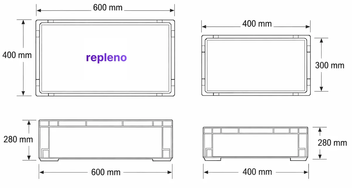 In everyday language, the terms blur. Often people mean standardized Euro base sizes like 600×400 mm. “KLT” is used more frequently in production and line supply contexts, especially when referring to industry standards (e.g., the VDA system).